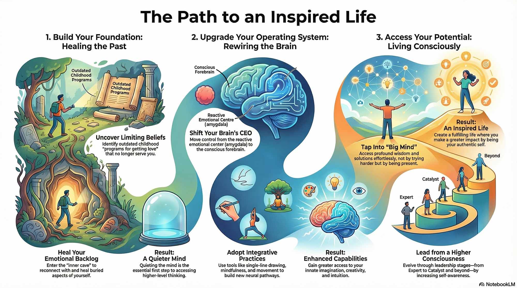 The infographic above titled The Path to an Inspired Life visually maps an inner transformation process through 3 interconnected stages: healing the past, rewiring the brain, and living consciously. Rather than presenting change as a linear self-help checklist, it illustrates how meaningful transformation unfolds from the inside out.
